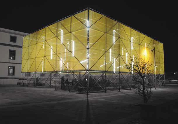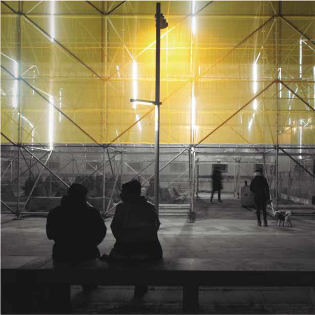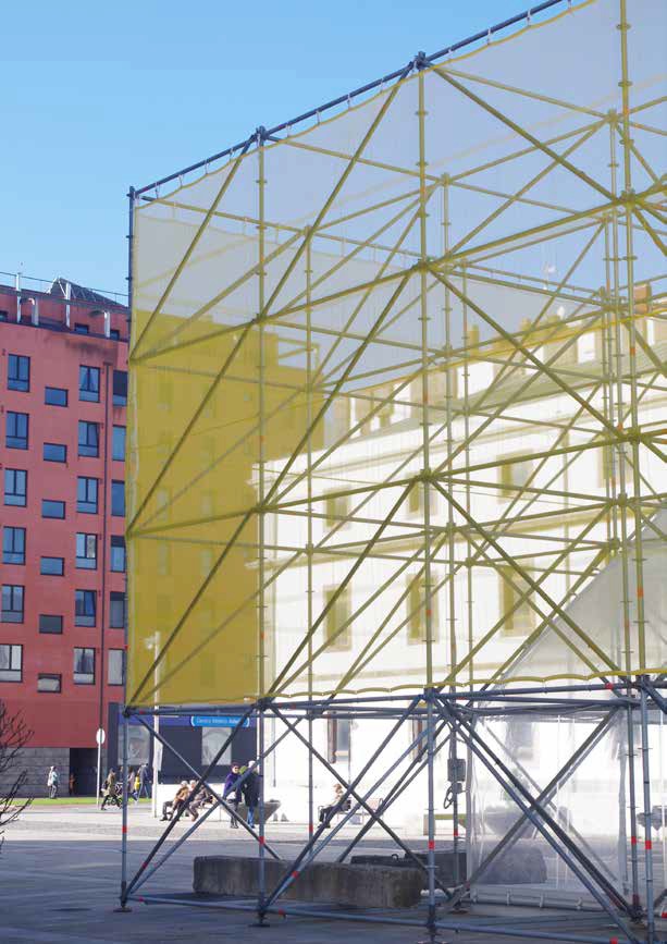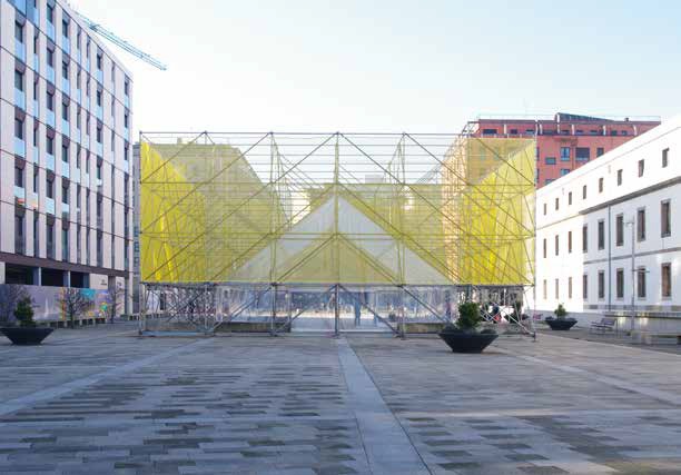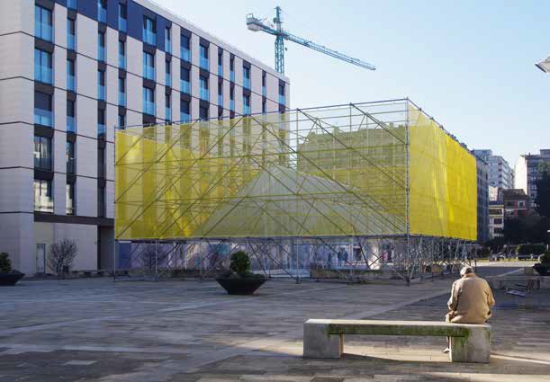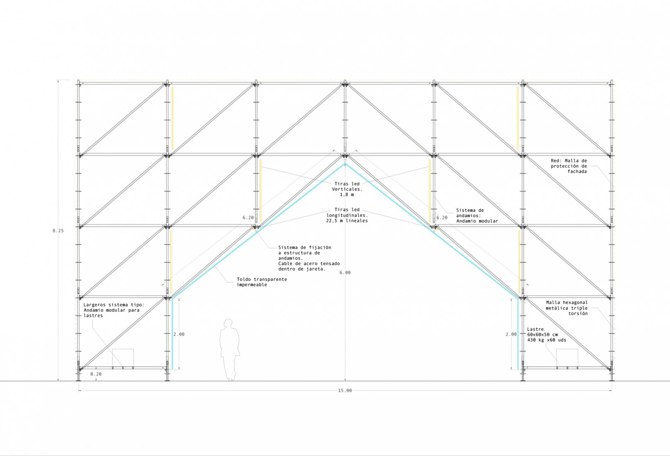 Debido a la temporalidad de la instalación, se utilizan elementos desmontables y reutilizables, como son las estructuras de andamios: una matriz capaz de acoger múltiples usos a lo largo de los meses. Se manifiesta como un volumen hecho con una densa malla espacial, sobre la que se practica un vaciado interior cubierto a dos aguas. Exteriormente se cubre con una red, la cual perfila el volumen, pero muestra su estructura interior. Tribuna Pública fue una estructura efímera, abierta, diversa, hablada, vivida, transformada y pensada.