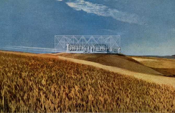 Como emplazamiento hemos imaginado un promontorio o loma en medio de un campo de espigas. La forma brillante del templo emergerá así como sobre la cresta de una ola en el mar de espigas de la meseta de Castilla. Esta breve explicación y los planos que veis os orientarán sobre nuestra idea; pero si os parece conveniente, expondremos brevemente algún punto que nos sirvió de fundamento. El problema del templo es, y ha sido siempre, de una capital importancia para la arquitectura. La Historia nos muestra que se han utilizado siempre las formas más nuevas, más atrevidas y audaces. Si unas y otras fueran templo, edificio religioso, fue porque en ellas el arquitecto, artista, supo infundirles un elevado sentido trascendente. Si cabe hablar de tratamiento religioso de una forma de arte, no cabe, sin embargo, decir que una estructura sea en sí o no religiosa. Si lo es, es –repetimos– porque en su empleo el artista infundió en ella aquel sello superior.