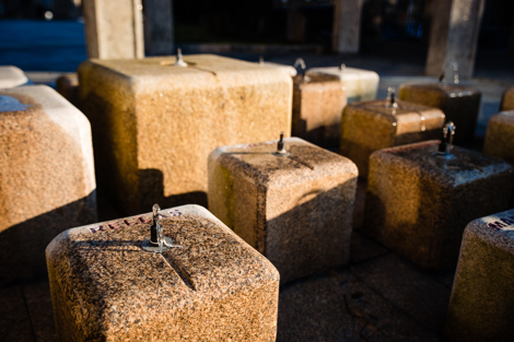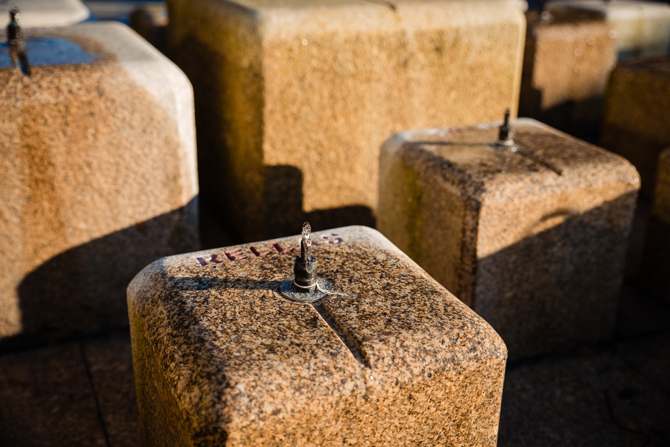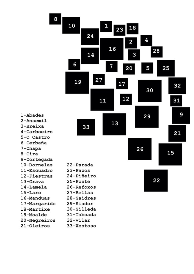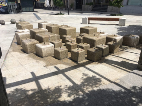 La fuente es un acercamiento plástico a la geografía de nuestro Ayuntamiento. Treinta y tres piedras de tres tamaños diferentes recrean una abstracción de las diferentes parroquias, su extensión y ubicación. Durante el verano funciona a modo de calendario indicando con un chorro más fuerte las romerías y verbenas del lugar.