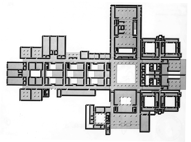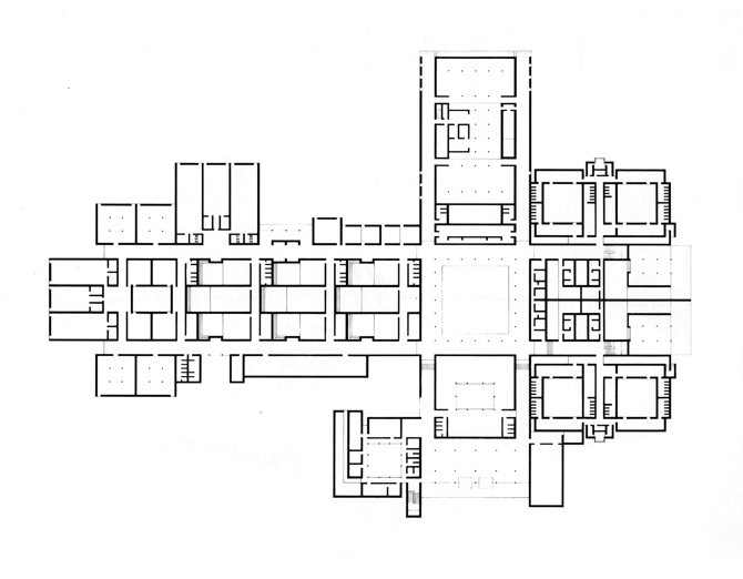 Lo esencial de esta arquitectura es la forma de tratar el espacio, de relacionar el interior con los espacios exteriores en una riquísima gradación de ambientes. En este caso límite, la sequedad del clima, el viento y el polvo, la luz deslumbradora, aconsejaban un edificio cerrado al exterior y abierto hacia infinidad de patios interiores.