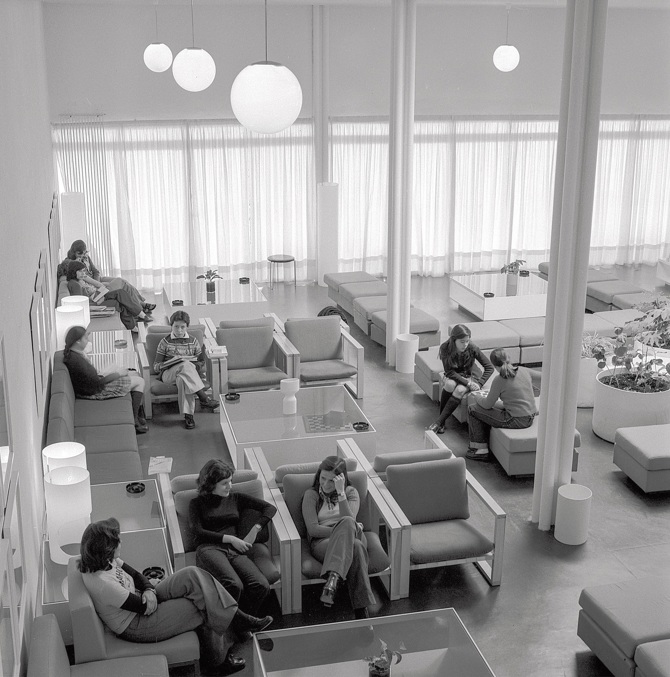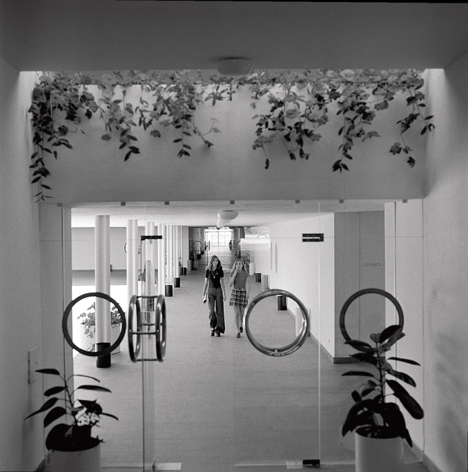 El programa se desarrolla sobre dos sistemas de ejes paralelos que se cruzan formando una plaza central, punto de confluencia de todas las circulaciones; hay veintitantos patios, grandes y pequeños, de distinto carácter y función. Las aulas se prolongan en un patio cubierto de emparrado que sirve de aula al aire libre. El resultado es un juego de volúmenes geométricos de muros encalados, de alternancia entre espacios abiertos y cerrados, de luces matizadas por toldos vegetales y abundancia de claraboyas, y todo ello dentro de una poética racionalista; y si bien la planta es tan racional y esquemática como un organigrama, la impresión que recibe quien recorre el edificio es de variedad y sorpresa.