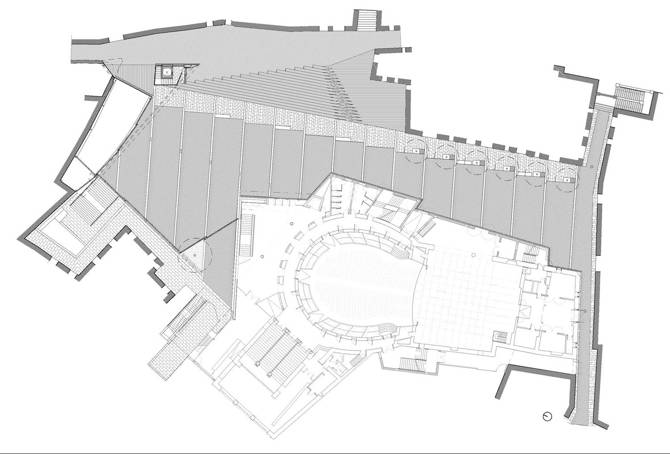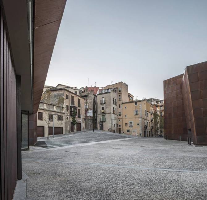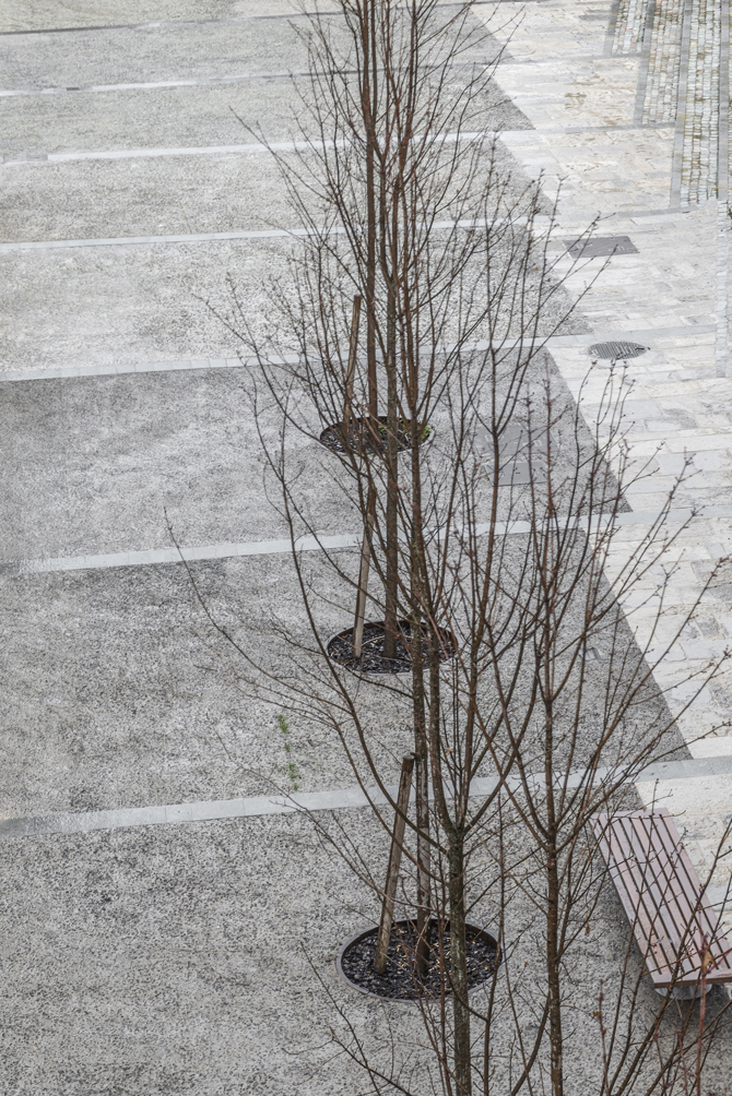 - La unificación del conjunto con la creación de un gran espacio longitudinal, formado por una superficie continua que une las diferentes partes del área y una grada como solución a la discontinuidad topográfica entre el nuevo espacio central y la pendiente de la calle.