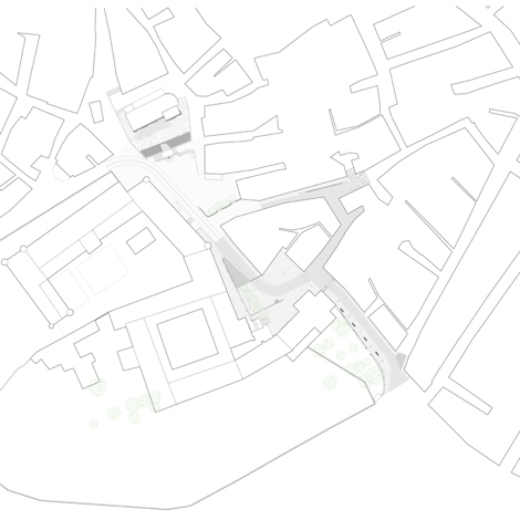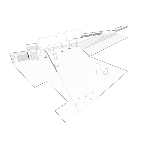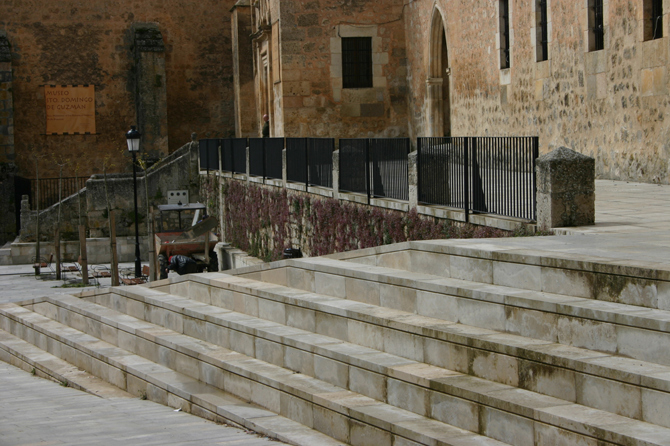 La propuesta contempla una redefinición de pendientes que se concretan en una línea marcada como junta que soluciona mediante una canaleta la recogida de aguas. Se proyecta la ejecución de una rampa, asociada a una escalinata-grada que soluciona la comunicación de la plaza con el espacio a cota de acceso al convento.