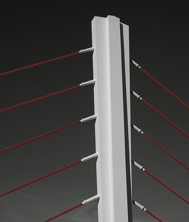 Situados en el eje central del puente, los cinco mástiles de acero dan origen a un conjunto de cables que desde sus cabezas se irradian para buscar su anclaje inferior en la mediana del tablero, creando una superficie transparente que es bien percibida por los conductores, previniéndoles de las cerradas curvas del trazado.