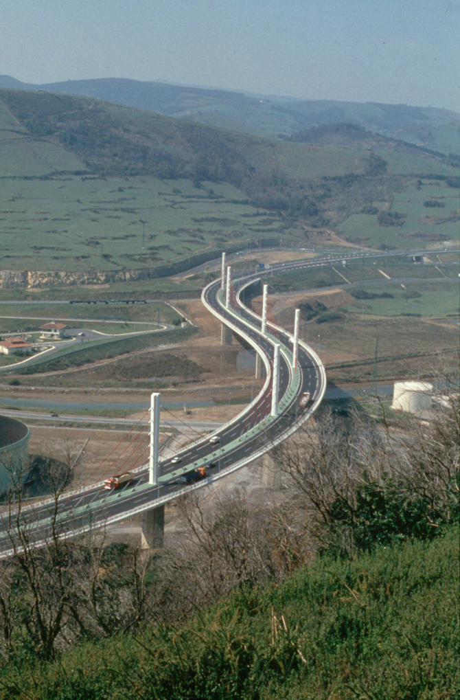 Su procedimiento constructivo fue peculiar, ya que cada vano de construcción mixta se fabricó sobre el suelo y se elevó a su lugar definitivo mediante gatos hidráulicos. Las flechas fueron compensadas con la puesta en tensión de los tirantes tras el montaje de los mástiles. La estructura, nítida y brillante, sigue el eje curvado de la serpenteante autovía. El conjunto del cajón central del tablero curvo con sus costillas crea una impresión visual que se asemeja a un cuerpo vertebrado y dinámico.