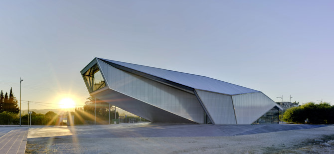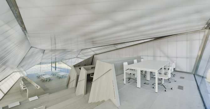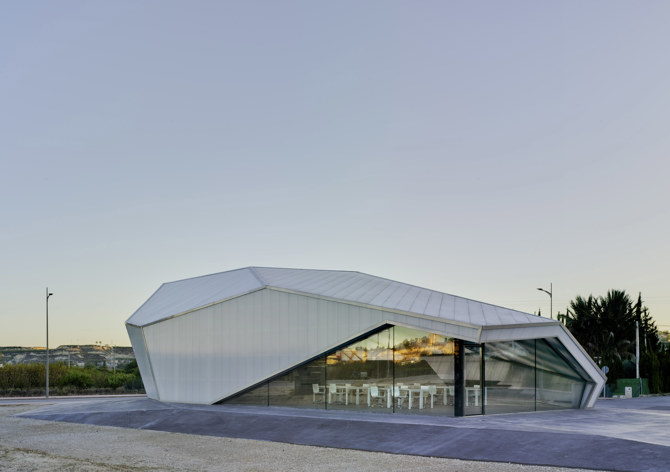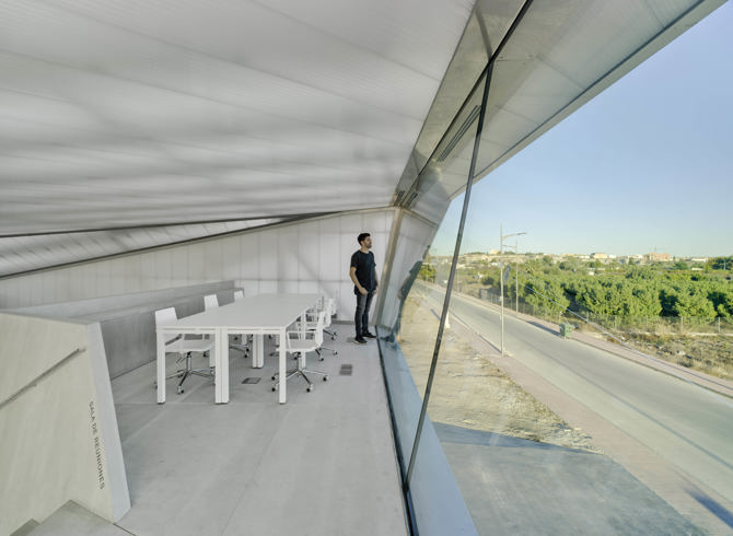 Proponemos un espacio interior abierto, distribuido mediante una planta escalonada en la que se reparten las diferentes estancias adaptadas a cada uso y envuelto por una doble piel de policarbonato translúcido, que permite intuir lo que ocurre en su interior y que cambia su aspecto según la hora del día, llegando a crear una imagen de encendido de todo el edificio.