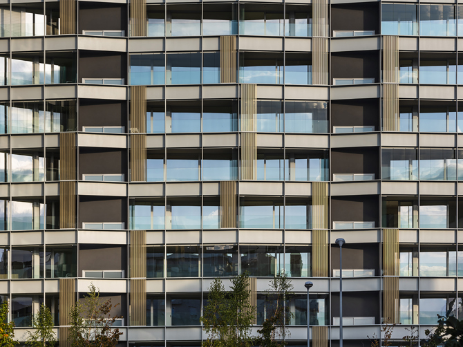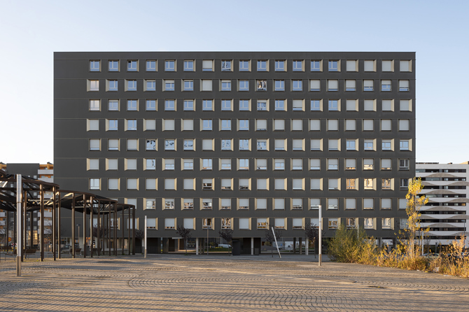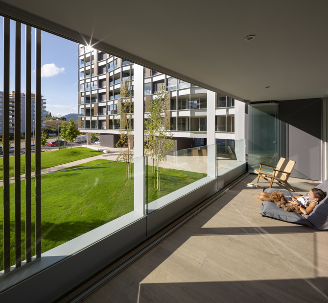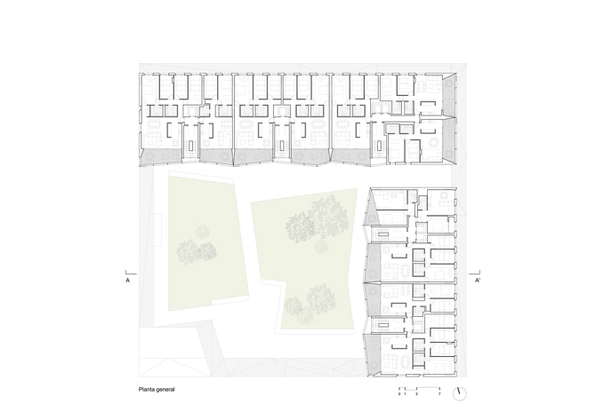 El proyecto se entiende como un soporte capaz de recibir los distintos modos de habitar del usuario, donde los sistemas constructivos (estructura, servicios y envolventes) definen en cada vivienda un único espacio diáfano que puede y podrá adaptarse al programa y necesidades de cada vecino, presentes y futuras. Cada vivienda se asoma al espacio compartido a través de un único gran hueco, mostrando sin complejos su actividad a través de una superficie “extra” transparente, abierta y de uso libre. Por el contrario, las piezas más íntimas de la vivienda se disponen en la fachada opuesta, configurada en base a la repetición seriada de un mismo hueco.