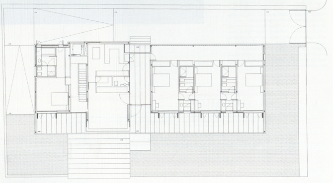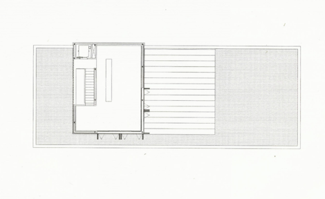 En planta baja, un amplio vestíbulo divide la vivienda en dos zonas, separando el módulo de los propietarios de los tres dormitorios de invitados. La orientación sur de la vivienda permite que las estancias se abran completamente al jardín, mediante una terraza corrida elevada 1/2 metro que actúa como espacio intermedio entre exterior e interior. Un contenedor exterior de paneles prefabricados de hormigón unifica los volúmenes. En el interior, una piel ligera de paneles de madera de baquelita permite a los usuarios matizar su relación con el espacio exterior, cerrando completamente la fachada o proyectando el espacio interior hacia el jardín. En la planta alta, una estancia de 60 m2 sirve como espacio de reunión y se abre completamente en la dirección sureste para capturar las mejores vistas.