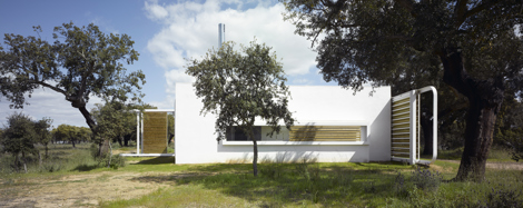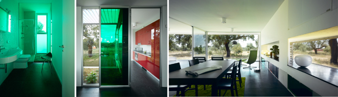 Es una casa que se expande y crece cuando está habitada, permitiendo disfrutar del contacto directo con la naturaleza. Las sombras, el grosor de los muros, la profundidad de los huecos permiten grandes ventanales con un ambiente interior protegido del sol y el calor. Estos muros gruesos se aprovechan para situar espacios de almacenaje, repisas, bancos… Muros equipados alrededor de los que se desarrolla la vida en la vivienda. Un único material en el suelo, pizarra negra en contraste con las paredes blancas, proporciona este marco en el que lo importante es disfrutar del exterior, del campo, de las plantas. Sobre este fondo blanco, algunos elementos aportan colores vivos, filtros de color en mamparas o puertas que permiten una mirada distinta.