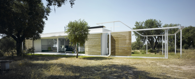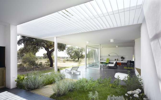 La naturaleza, convertida en objeto de afecto, entra a formar parte de la vivienda. Un sistema de grandes portones correderos cierran la casa completamente cuando no está en uso. Esos mismos portones se abren al paisaje cuando está habitada y proporcionan sombras en el entorno inmediato de la casa.