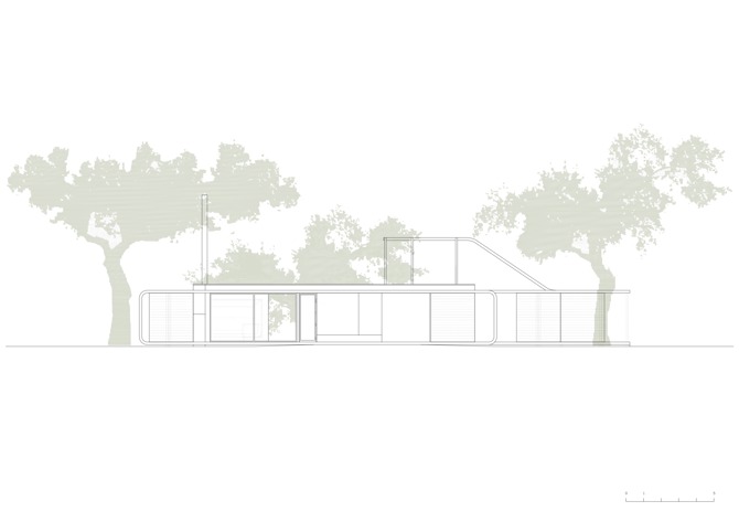 La Casa entre Encinas busca satisfacer el deseo del usuario de contemplar la puesta de sol y el fuego de la chimenea al mismo tiempo. La construcción envuelve el entorno, apropiándose de un encinar lleno de recuerdos familiares. Se extiende más allá de sus límites, abrazando los árboles a su alrededor y acogiendo parte de la vegetación en su interior en forma de patios o plantaciones en el porche.