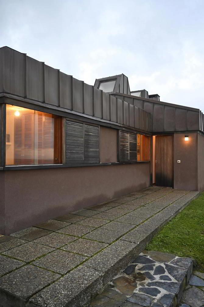 Se diseñó una ventana especial corredera con lunas de 10 mm colgadas sobre cojinetes, para que no hubiese interrupción de la visión, protegida con unas robustas contras de lamas de madera también correderas. Los acabados exteriores están realizados con granulite impermeable y la cubierta es de chapa de acero plegada.
