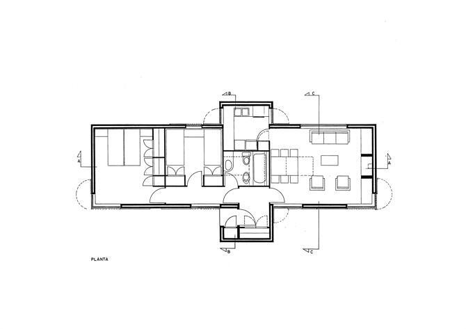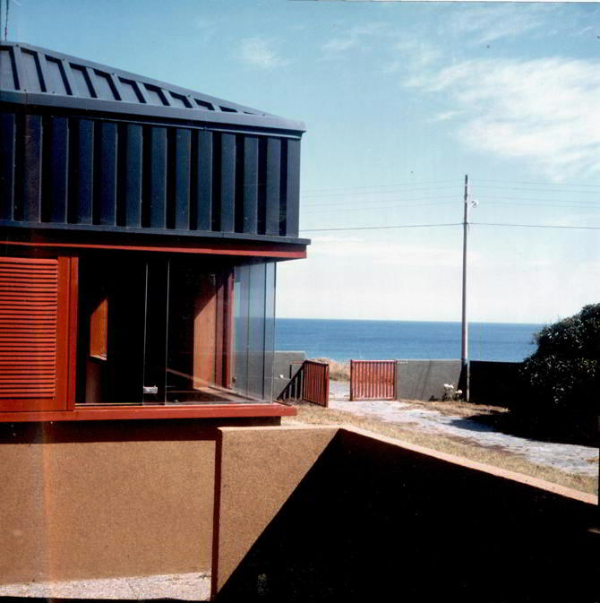 La vivienda proyectada es de dimensiones mínimas y está pensada para fines de semana y estancias cortas. Dado que las vistas eran un tema dominante, se decidió situarla paralela a la costa, consiguiendo el soleamiento de mediodía a través de unos lucernarios sobre la estancia y el cuarto de aseo.