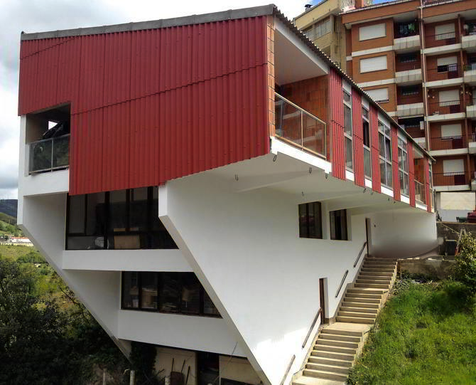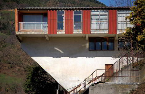 Tras terminar el barrio obrero del Fuejo, en Cangas del Narcea, Gómez del Collado afronta su propia casa-estudio con materiales y principios similares a los propuestos en esa obra: fibrocemento en cubierta y fachada —en este caso pintado en tono burdeos—, huecos de vidrio de suelo a techo y estructura de hormigón que le permite colocar la vivienda en planta superior, con un importante vuelo sobre el estudio.