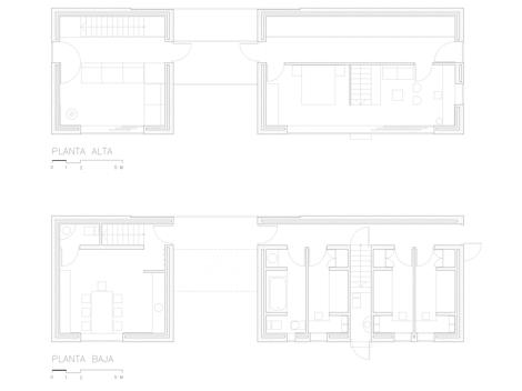 La estructura compositiva de la vivienda se distribuye en dos cuerpos independientes de planta baja y alta, unidos ambos por la cubierta, que es común a toda la edificación y un puente-pasarela que une la planta alta de ambos volúmenes.