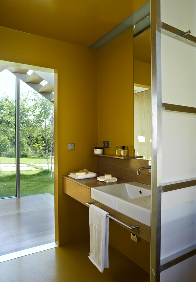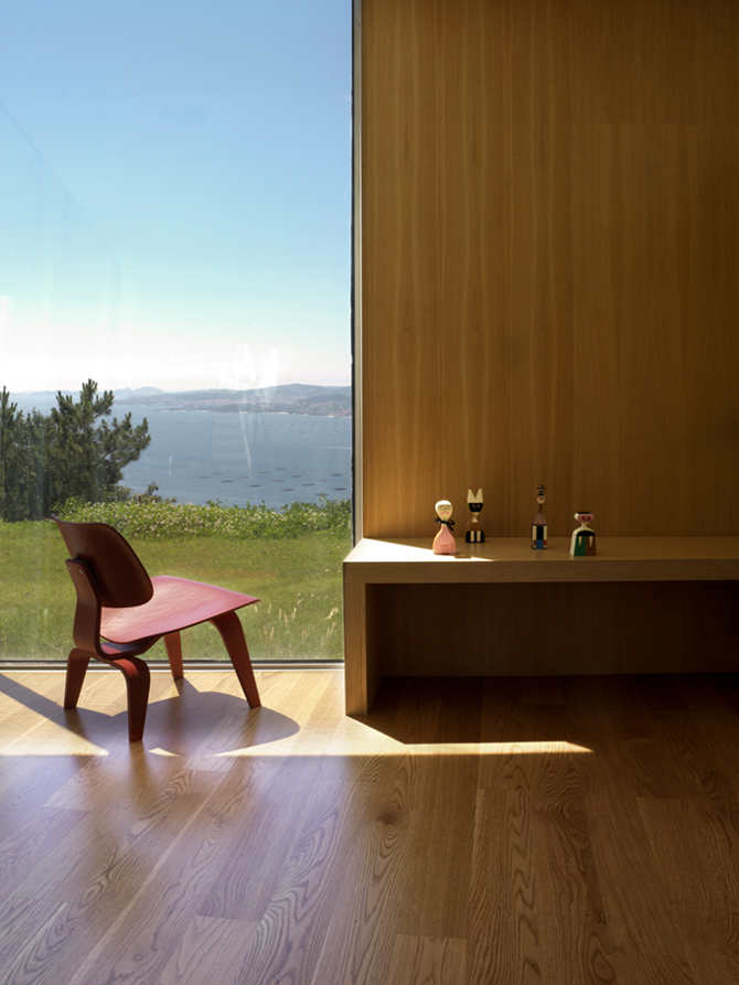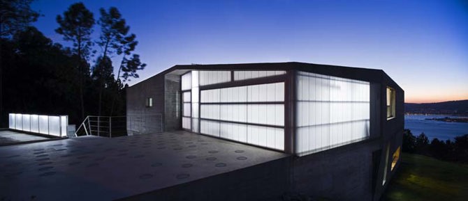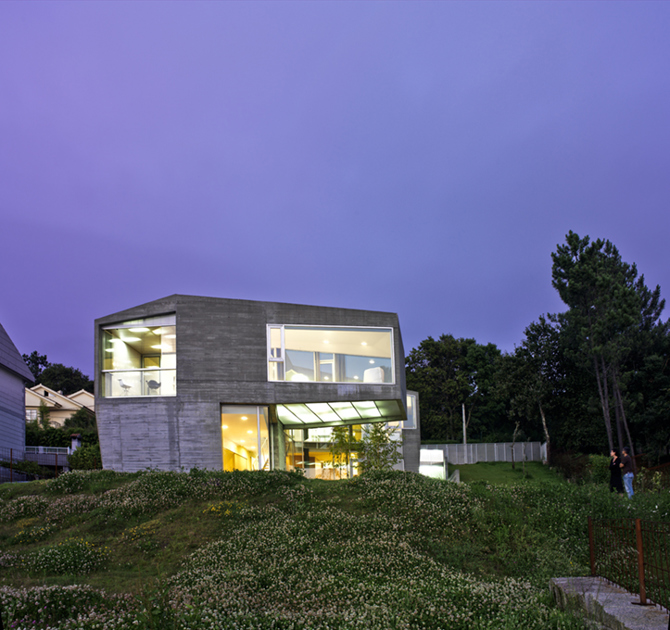 Una lámina de hormigón se repliega a modo de cáscara desde su arranque como muro de contención, formando un volumen que en su vaciado ofrece desde lugares recónditos y ocultos a la mirada, secuencias intermedias donde se deja penetrar por la naturaleza, hasta un espacio final que se dispara hacia el exterior, con la mirada dominante sobre el paisaje lejano, devolviendo a los propietarios aquella mirada detenida sobre la ría, que les hizo elegir este sitio para vivir. La forma de la cáscara a la vez que acoge el programa, resuelve la estructura, los planos que conducen las aguas, y las diversas escalas que conforman la diversidad espacial en el interior.