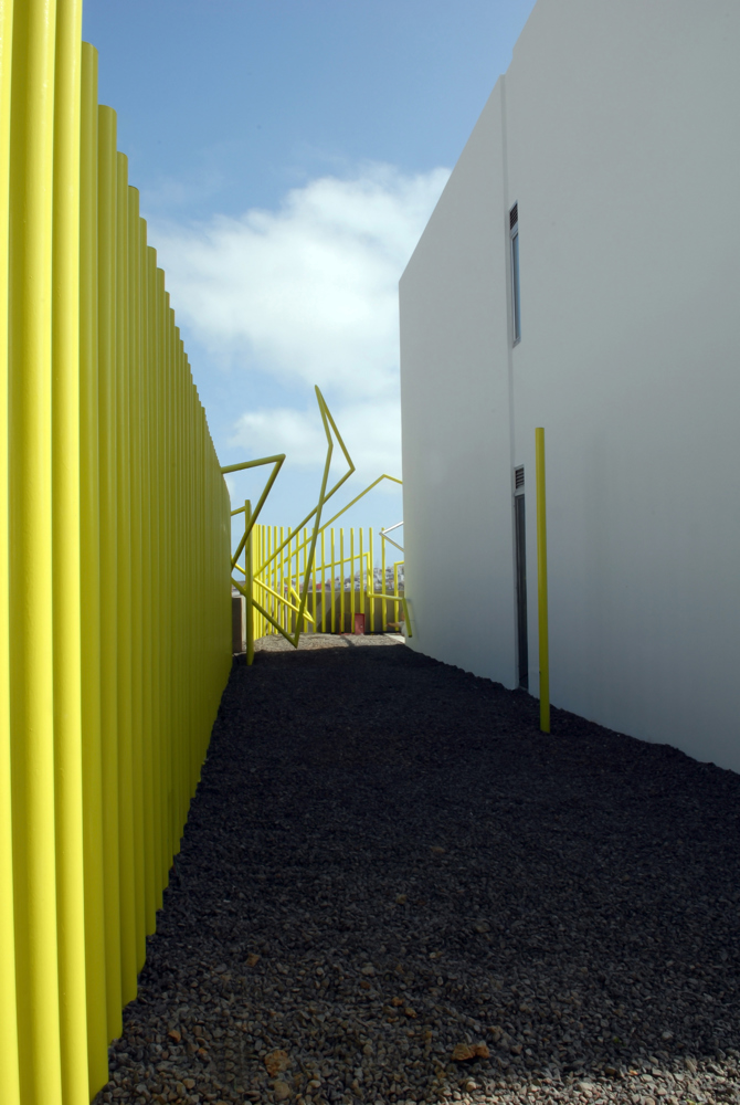 Una escultura multifunción que genera escenas de gran plasticidad soporta el alumbrado exterior, contiene hilo musical, una ducha, a la vez que protege; un elemento dinámico y cambiante que aporta valor añadido.