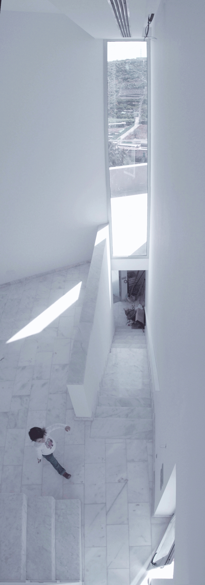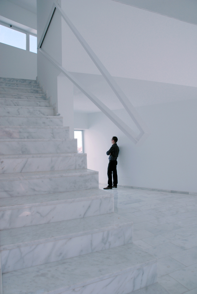 La casa busca las relaciones deseadas con el contexto. El interior se ahueca en busca de relaciones diagonales, se llena de luz natural. Al exterior, la casa se muestra compacta, más hermética.