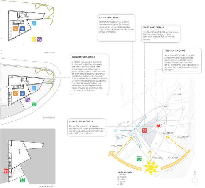 El dormitorio mira a la cumbre, el despacho al mar, el salón a la ladera no construida y otras estancias enmarcan fragmentos del cerramiento.