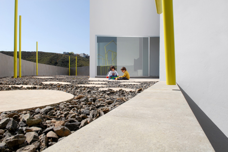 La casa así concebida emerge desde dentro, evadiendo condicionantes geométricos impuestos. El zócalo masivo, que contiene la parcela, se perfora solo para permitir el acceso; sobre este, el cerramiento se desmaterializa.