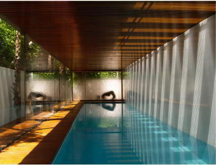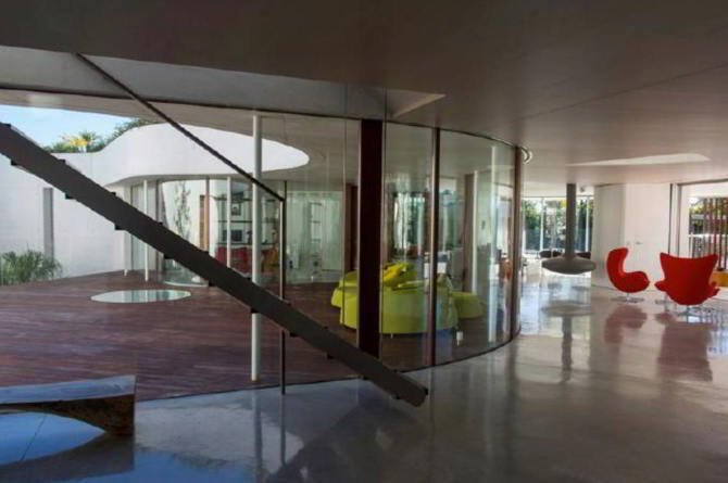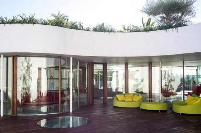 Su sinuosa silueta juega con la vegetación que la rodea, que brota de su cubierta y que, en puntos estratégicos, irrumpe en su interior. Los paramentos curvos definen el contorno de la casa y también cualifican los espacios interiores y los de transición hacia el exterior. Un proyecto totalmente libre y sugerente, ejecutado con un dominio de geometría, materia y técnica que permite un juego de relaciones visuales, reflejos y matices en contrapunto con la exquisita intervención que la arquitecta proyecta para la zona más reservada de la piscina enterrada.