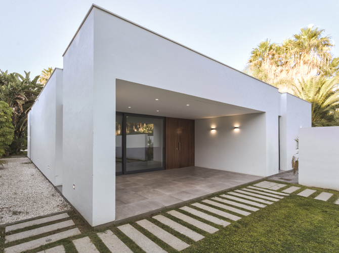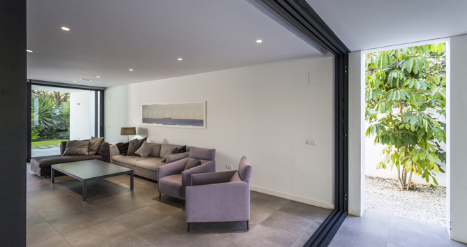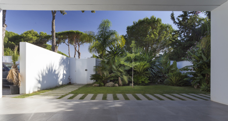 El aguacatero de 30 m de altura se encontraba en el centro del huerto, por lo que había dos opciones, o salvar la piscina o salvar el aguacatero. Se opta por ubicar la casa en la zona del huerto, dejando la piscina y el jardín de esta intacto y se centra la edificación en la zona sur de la parcela. Al quedar la piscina existente al norte de la edificación, se decide separar la casa por un eje que divide la casa. A un lado la zona de día, con un salón con miradas a dos jardines, con dos porches cubiertos extendiendo los salones, al jardín norte el existente donde se encuentra la piscina, y el jardín sur de nueva creación.