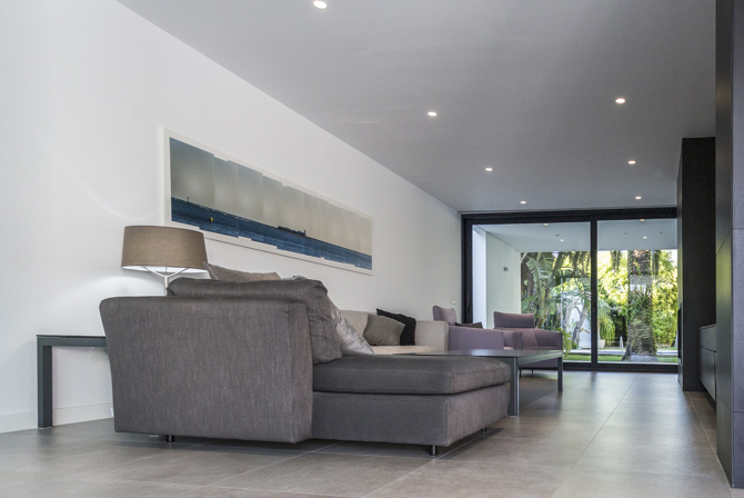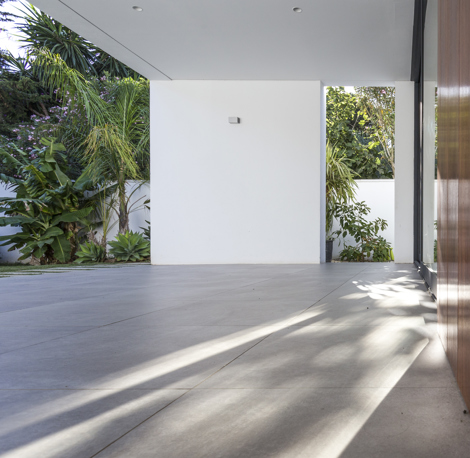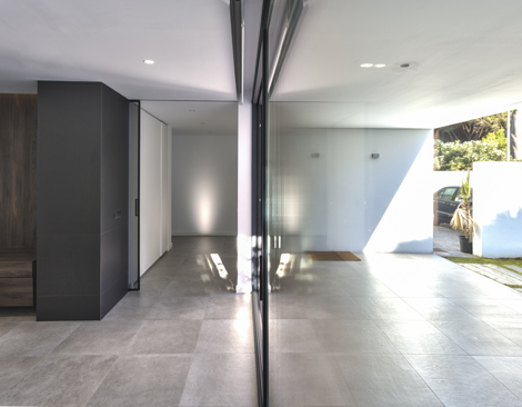 Este muro que divide la casa se convierte en la idea del proyecto extendiéndose hacia el exterior, dividiendo también en la entrada, la zona de recepción de la de garaje. Los grandes vidrios de suelo a techo permiten la transparencia de la parcela en el eje norte-sur para aprovechar la profundidad de esta. Al este y al oeste la casa se cierra como un contenedor para reforzar la idea del eje.