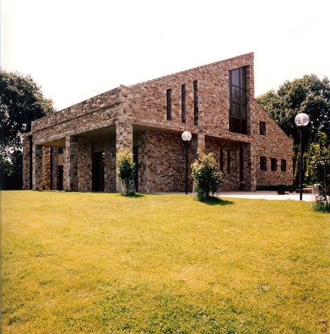 Estructura de pilares y vigas de hormigón. Combina piedra y pintura en los acabados.
