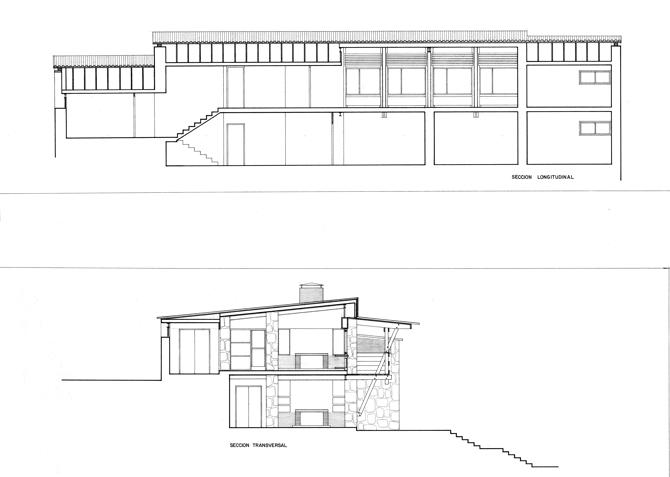 Es un pabellón con un solo faldón de cubierta cogido por los hastiales de gruesa mampostería, incrustado en el terreno y envuelto por la vegetación que se hizo repoblando y arruinando el monte a sus costados. La cubierta contra la pendiente del terreno se abre, por la fachada opuesta al acceso, al paisaje de la lámina azul del embalse con el fondo de la sierra. Así la sala de estar y comedor queda de puente sobre un gran porche que repite su planta como estancia al aire libre entre sus dos estribos perpendiculares, en uno de los cuales se sitúan los dormitorios a media altura de las dos plantas y en el otro el ala de servicios con la cocina oficio, dormitorio y aseos en planta alta y cuarto de útiles, taller y garaje en la planta baja. De ambos lados se sale al porche directamente para no interferir con su circulación la sala de estar.