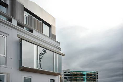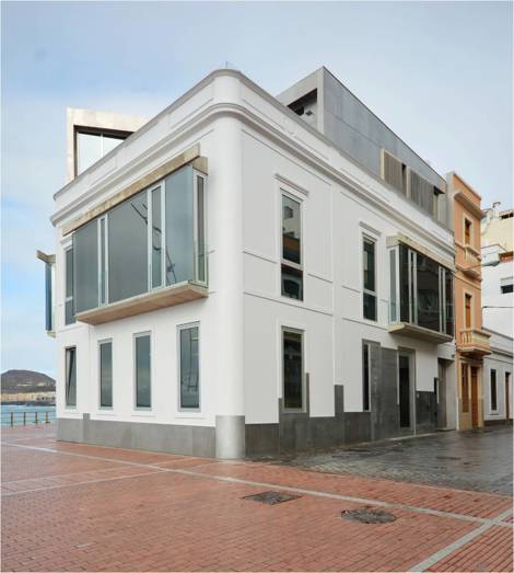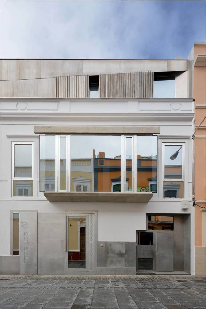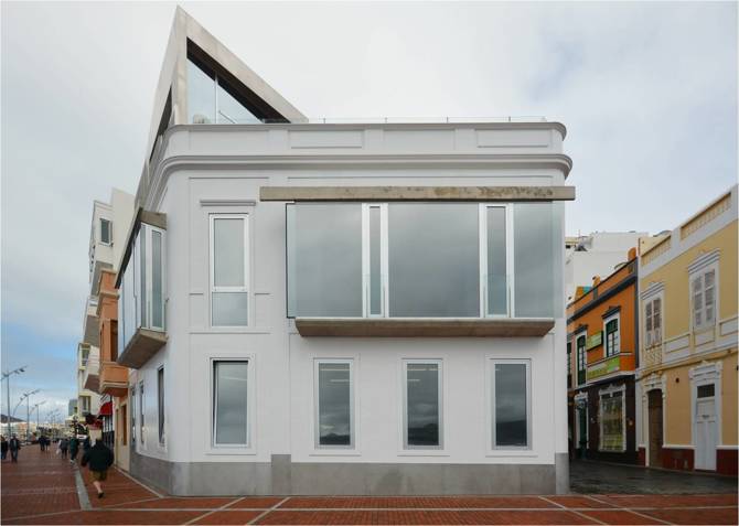 En la vivienda en el muro Marrero en la playa de Las Canteras sucede que la fachada original de la casa de trazas coloniales inglesas construida a principios del siglo XX es objeto de protección. Por ello la intervención adquiere la apariencia de una escenografía de carácter “telescópico” donde el nuevo cuerpo que emerge sobre la cornisa y que se ejecuta en acabado de aluminio de aleación naval exhibe las huellas a modo de ranurado vertical de esa supuesta condición deslizante. A modo de aparición, el nuevo volumen se asoma para atrapar desde su perfil abocinado las vistas del horizonte marino.