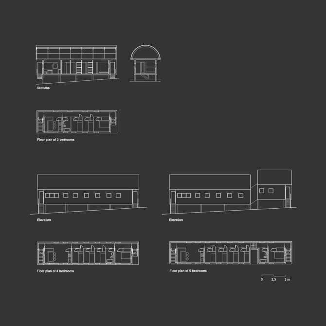 Después de varios intentos de agrupación de las viviendas en un único edificio y de escuchar a los futuros usuarios, se optó por pequeñas construcciones aisladas de tipología muy definida, con antecedentes en el carro gitano, el hórreo y el vagón de literas, lo que dio como imagen resultante la de un campamento gitano integrado por carros que también recuerda, por el tipo de asentamiento sobre una topografía accidentada, a un campo de hórreos.