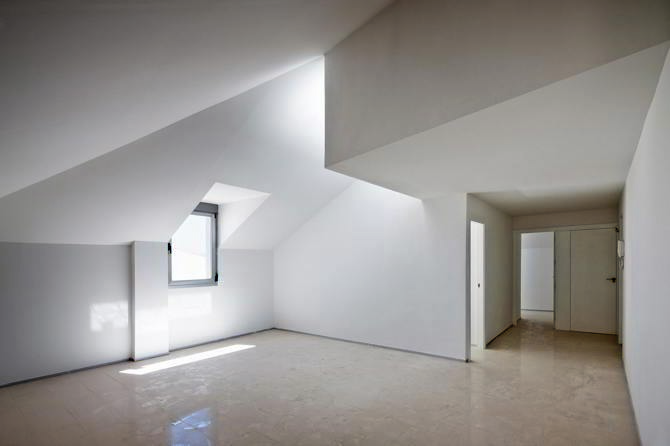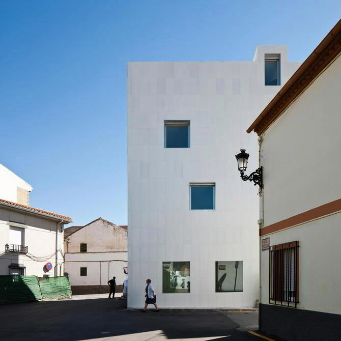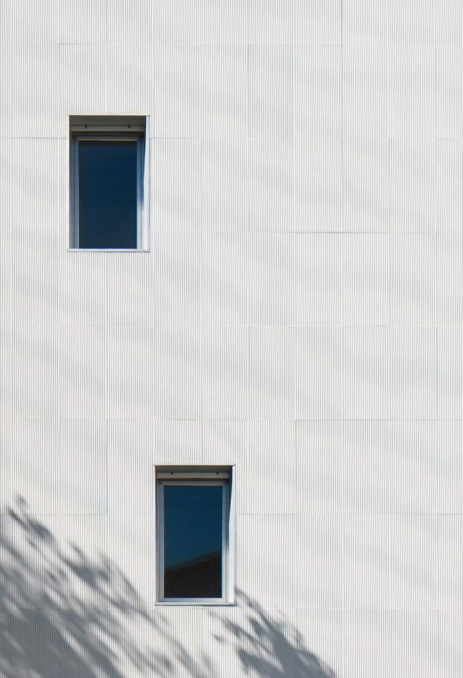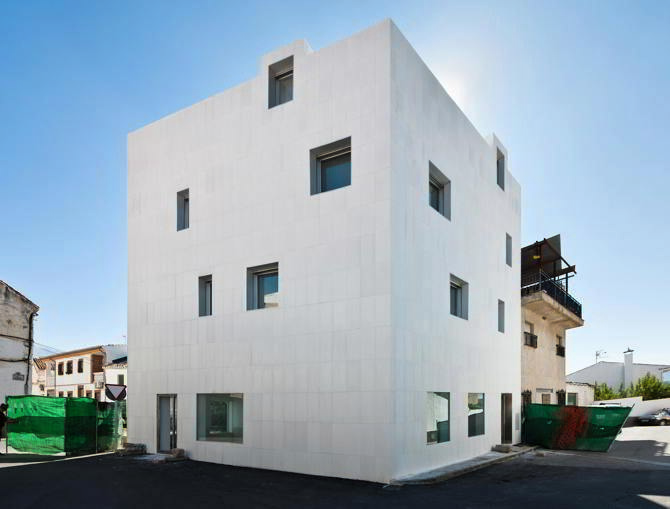 Todo el edificio, tanto las fachadas como la cubierta, se reviste con una pieza de gres de alta temperatura bicocción 1220 grados esmaltado en blanco sierra nevada. Esta pieza de 40×80 con la que se ha modulado todo el edificio está atravesada por alveolos que por medio de grapas ocultas se anclan a la fachada.