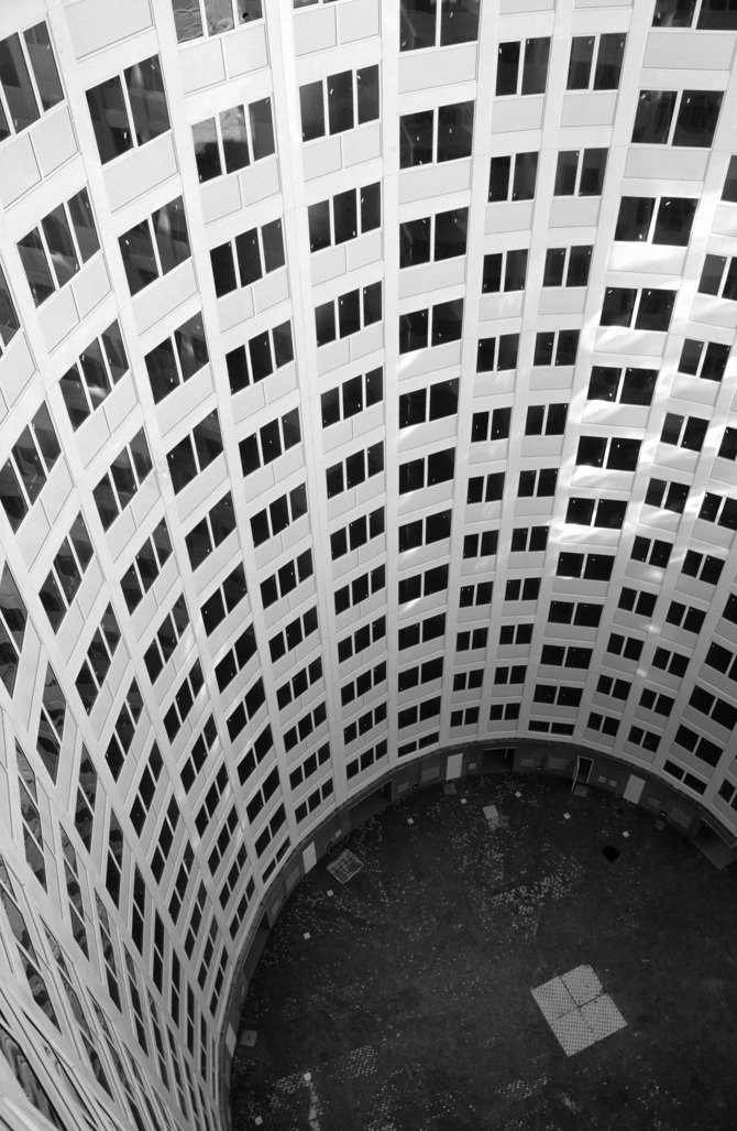 Torre de 15 plantas en forma de caracola nautilo. La profundidad construida de la torre crece cada tres escaleras al aumentar el número de dormitorios en las viviendas. El muro cortina, fachada del patio de la torre, se abre al norte sobre Madrid.
