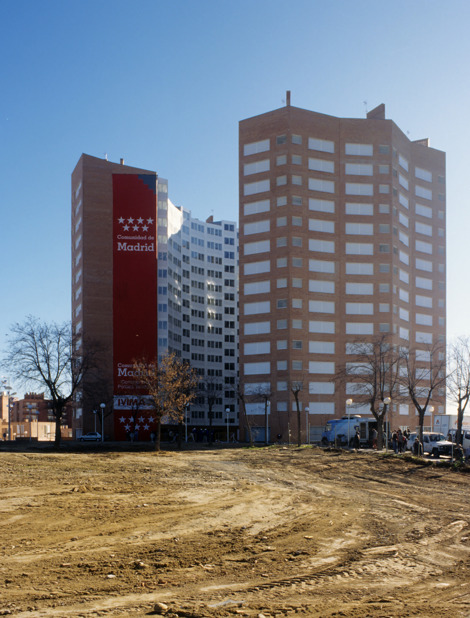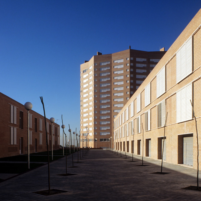 Otras viviendas y servicios comunitarios se sitúan próximos a la torre en bloques longitudinales de tres plantas. Un fragmento más del gigantesco barrio de ladrillo de Palomeras.