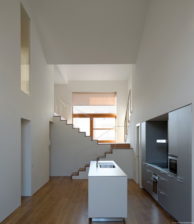 Todas las viviendas del programa se desarrollan en dos plantas, con doble orientación, ya que las fachadas se abren tanto al exterior como a los espacios libres interiores. En general, las viviendas constan de una estancia de doble altura a la que también se asoman las restantes habitaciones. Las cocinas se integran en el salón. Se han usado materiales similares a los usados en la construcción del edificio industrial existente –cerámica, enlucidos de cal, carpintería de madera– garantizando así una imagen homogénea y unitaria.