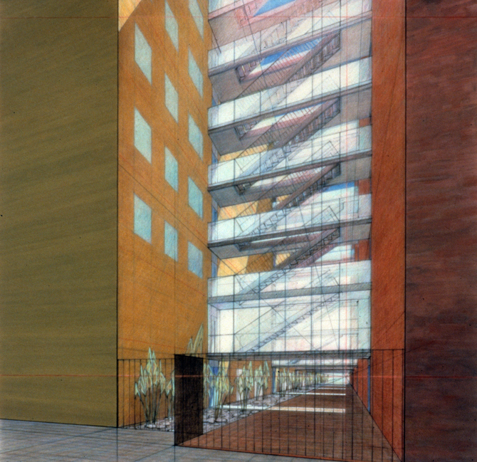 En este caso se enfatiza la solución desplazando los dos bloques y se acentúa con el cambio de material. Los dos bloques quedan vinculados por las escaleras transparentes, con un ascensor en cada uno de ellos.