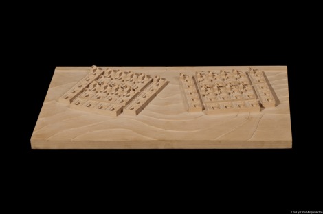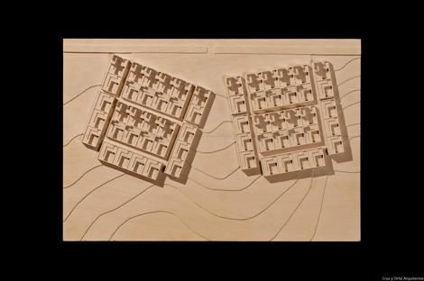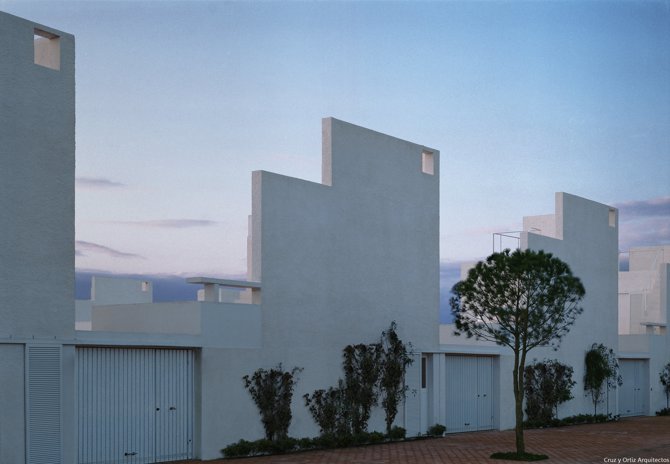 Dos intenciones básicas pueden encontrarse en este proyecto. De una parte, atender al confort y la privacidad de cada una de las casas y, de otra, encontrar una configuración de conjunto que englobe a las viviendas en unidades mayores. Así, estas se agrupan en dos núcleos muy compactos de forma aproximadamente cuadrada, que se disponen ligeramente girados entre sí. Independientemente de sus diversos programas, cada vivienda se asienta sobre una parcela idéntica de 16x13,50 metros, adoptando una disposición en “L” que permite las mejores orientaciones y generar un patio-jardín privado al que abren todas las dependencias de la casa. De esta forma, cada vivienda disfruta de un ámbito propio que garantiza la privacidad buscada y una buena protección contra el intenso viento de la zona.