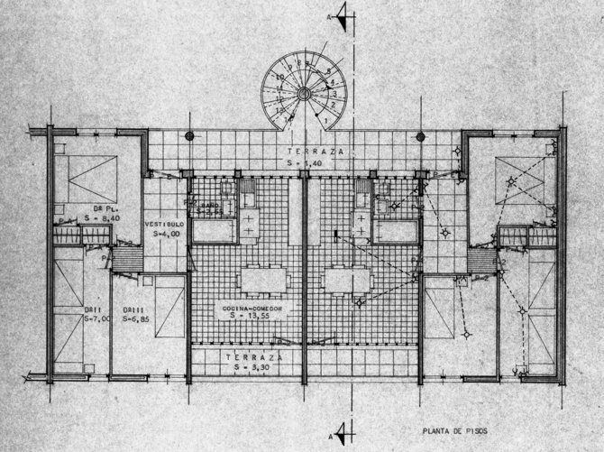 La parcela, con una topografía caracterizada por una fuerte pendiente, se estructura en dos plataformas sobre las que se asienta la edificación. La respuesta dispone las viviendas en bloques de tres plantas de altura, compuesto por módulos con una escalera exterior prefabricada, y un corredor abierto que da acceso a dos viviendas en cada una de las plantas altas. Se construyeron treinta viviendas cuyo programa, común para la época, consta de cocina-comedor, tres dormitorios y aseo, con una superficie útil aproximada de 43 m2.