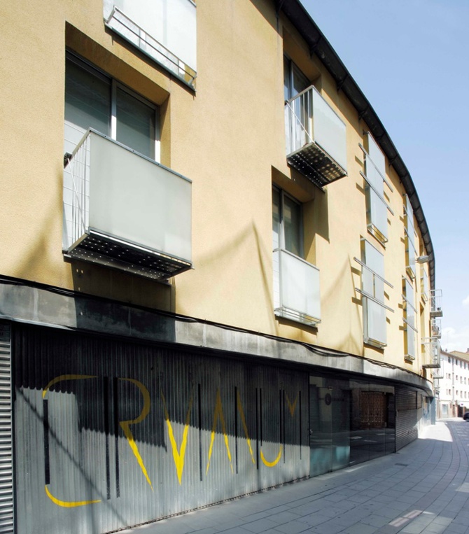 La fachada de las viviendas recoge deliberadamente los tópicos contextuales: ventanas alargadas, balcones, distorsionándolos, sin anular una imagen estereotipada que favorece la comunicación.