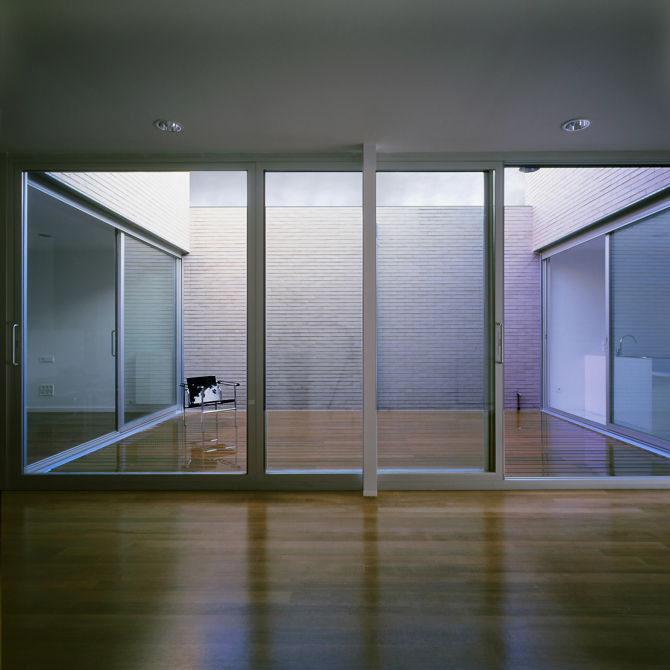 Los tradicionales límites de la casa quedan disueltos en pos de la creación de un nuevo lugar que une el interior y el exterior. La diferencia de cotas en el interior de la parcela permite que la casa no se ensimisme en sus patios, sino que a través de ellos se asomen a la ciudad. La continuidad inmediata de los espacios cerrados y espacios abiertos permiten definir la casa como la ocupación extensa de toda la parcela, convirtiéndo el espacio del habitar en un lugar que define el marco de un nuevo habitar.