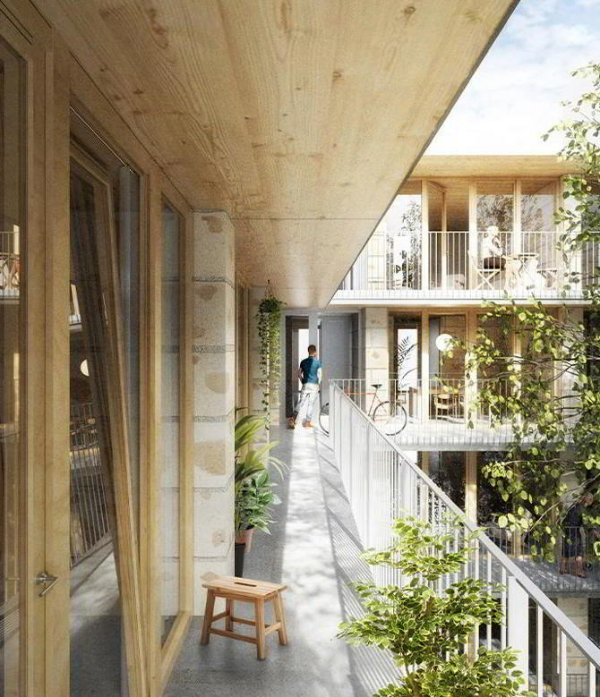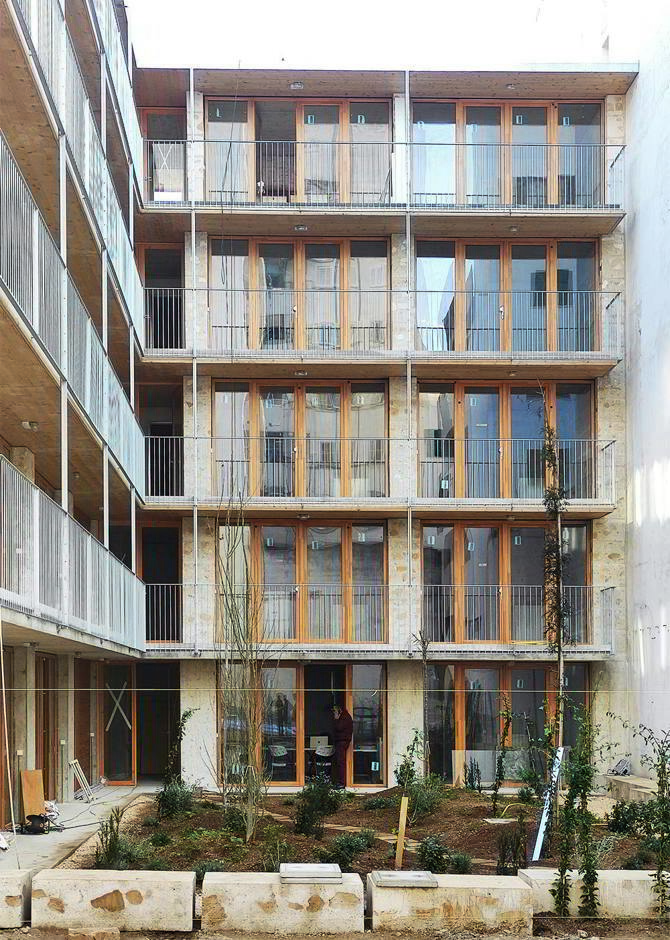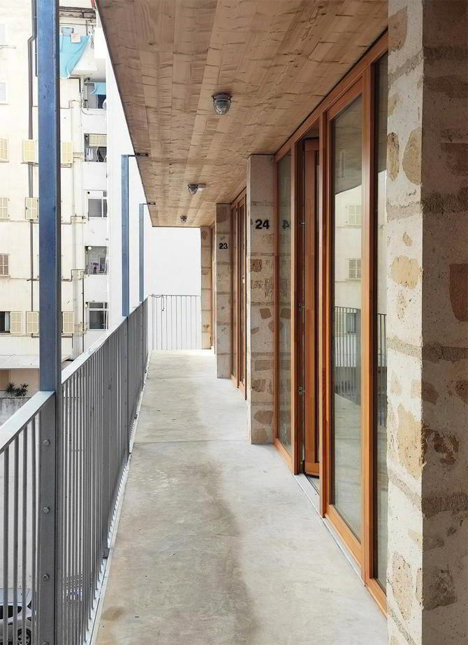 Una vez concluido el derribo, se aprovechará casi toda la ruina de la obra, según el tipo de material: en pozos de cimentación y construyendo grandes bloques de hormigón ciclópeo de cal mezclado con marés reciclado. Los bloques se apilan para construir unos muros de carga, reduciendo su grosor en cada planta para apoyar directamente los techos de madera contralaminada y reducir la duración de las obras. Toda la organización espacial y programática del edificio responde al sistema estructural descrito; la composición de la planta se organiza con un núcleo de escaleras en la esquina, que da acceso a una pasarela en el jardín interior, desde donde se accede a cada una de las viviendas, casi todas pasantes.