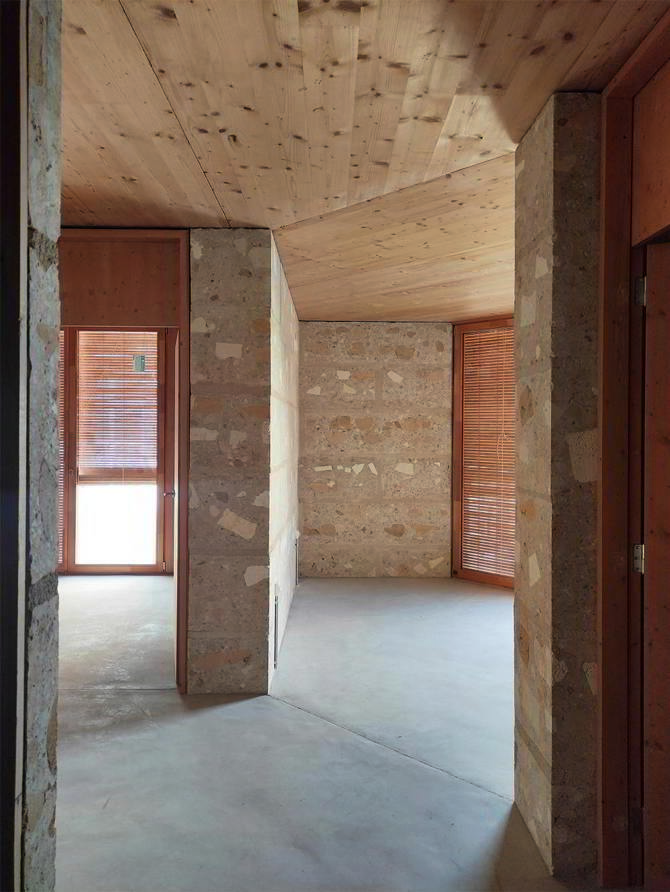 Los bloques se apilan para construir unos muros de carga perpendiculares a la calle, donde se apoyan los techos de madera contralaminada. En cada planta los muros reducen 10 cm su grosor permitiendo el apoyo directo de los paneles de madera. Los muros principales se traban con unos muros perpendiculares de 13cm construidos con la misma técnica, y que organizan la planta de cada vivienda.