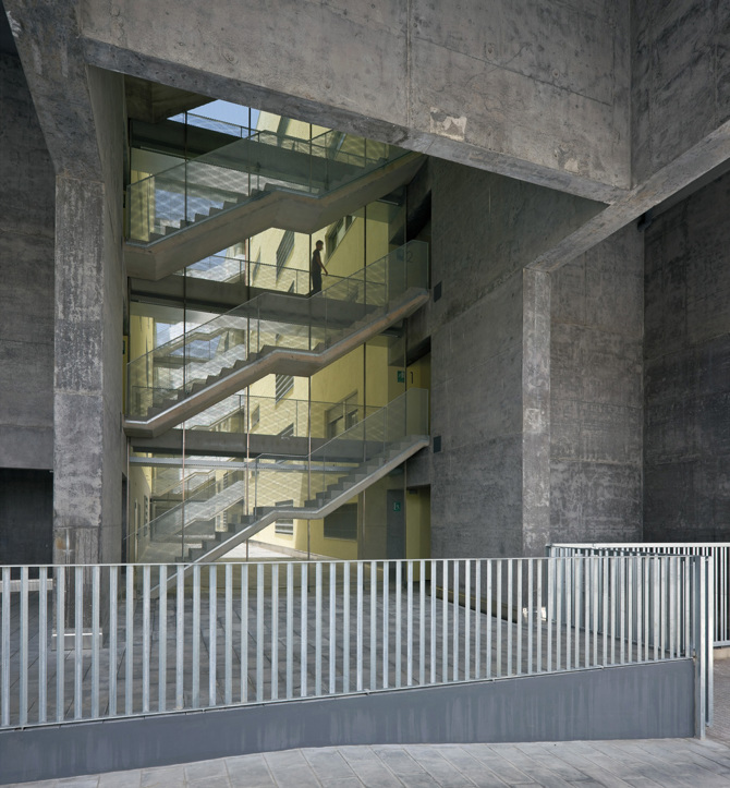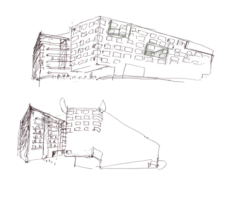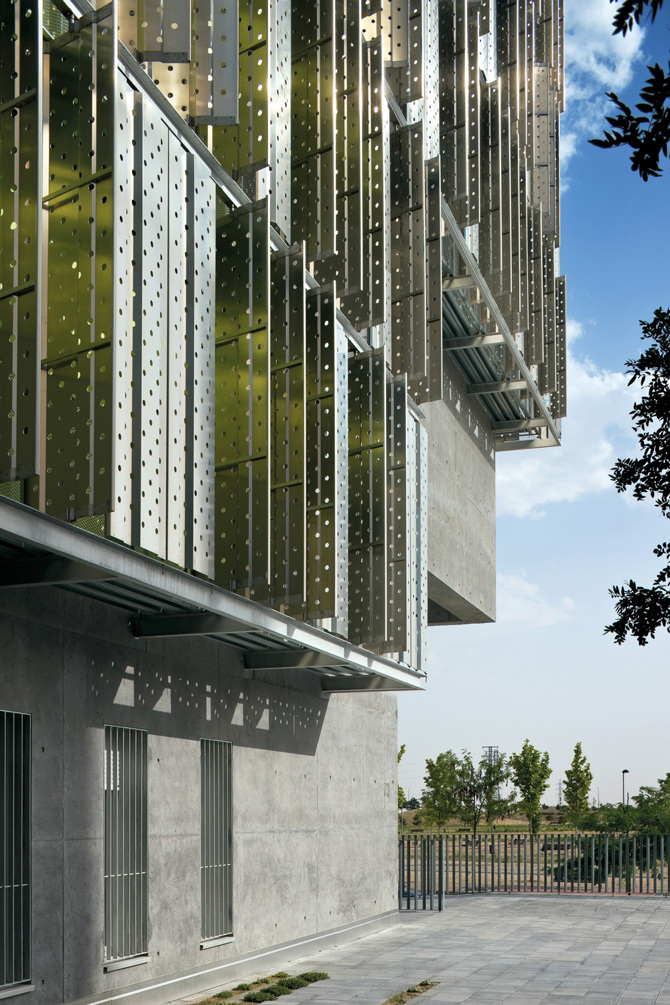 Los dos bloques no son iguales. Uno de ellos recibe en su extremo un corte sesgado al asumir la geometría de la parcela, cuando mira a la rotonda de tráfico. En el otro, operaciones de sustracción del volumen marcan el acceso al conjunto edificado.
