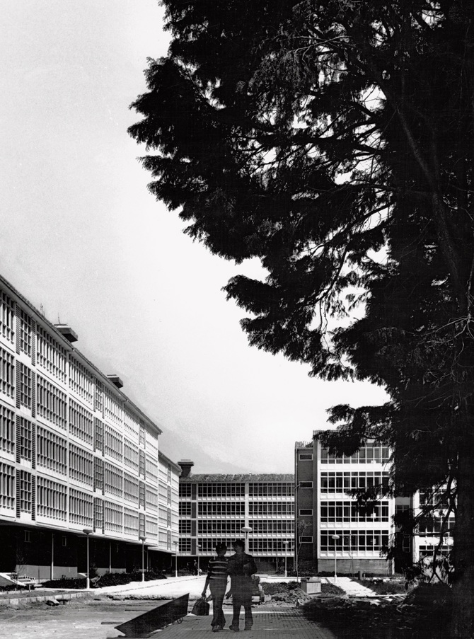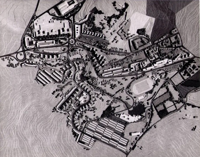 Dentro del planeamiento general de Vite, recibí más tarde, en 1960, el encargo de la Obra Sindical de redactar el proyecto de 284 viviendas a ambos lados de la carretera de La Coruña, formando dos pequeños núcleos. Eran también viviendas sociales sometidas a una normativa estricta y a un presupuesto siempre por debajo de las necesidades mínimas. En este caso conseguí un suplemento de un 10% para mejorar las fachadas por tratarse de viviendas muy visibles en el acceso a una ciudad de gran valor monumental. Tal como puede verse en las fotos de la maqueta, traté de lograr dos pequeñas agrupaciones de bloques dispuestos flexiblemente alrededor de sendos espacios urbanos, aislados y disueltos en el paisaje, como es tradición en el urbanismo de la España verde, cuidando mucho en el proyecto la ambientación paisajista. Era la ocasión, tanto tiempo esperada, de utilizar la galería gallega, tan funcional y bella.
