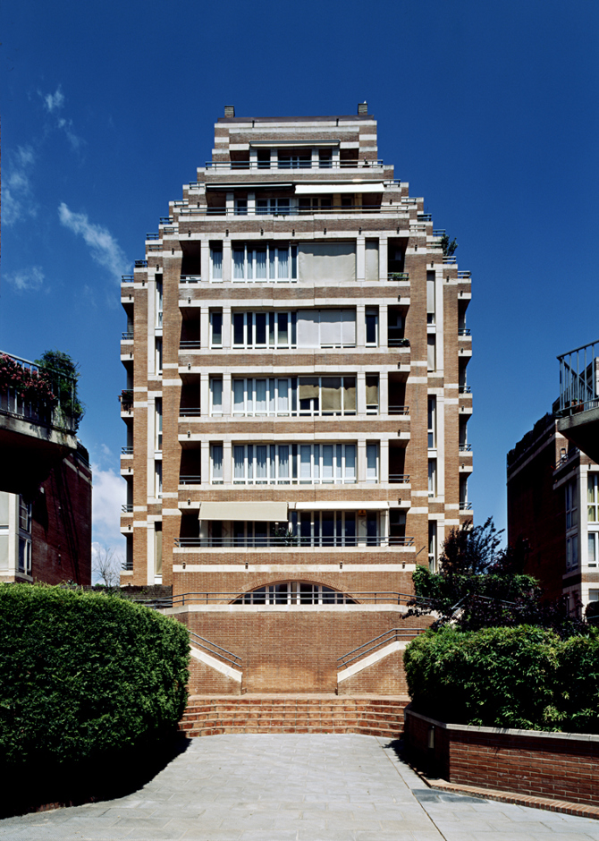 La vivienda-tipo incorpora el núcleo de comunicaciones en su centro geométrico, que está flanqueado por las zonas de servicio, separando claramente la zona de noche, orientada hacia el norte, y la zona de día, orientada hacia el sur. La fachada norte está recubierta de ladrillo de cerámica con ligeras incorporaciones de hormigón, mientras que la fachada sur combina superficies de vidrio con otras opacas de hormigón.