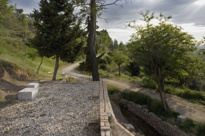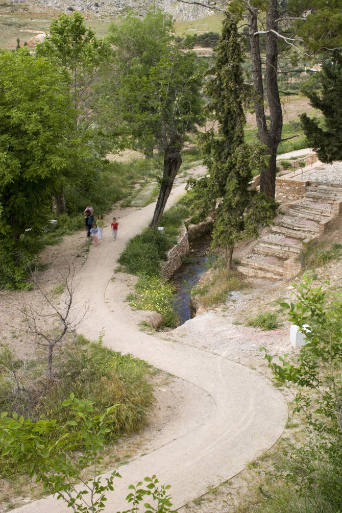 Sobre un antiguo sendero, el camino se extiende como una alfombra junto a la acequia recuperada introduciendo en el paseo el frescor y el sonido que caracterizan el paso del agua; e incorpora unas albercas existentes y nuevos lugares de parada determinados por piezas de piedra macizas que, a modo de bancos, incitan a detenerse para descubrir el paisaje. El agua de las albercas recuperadas riega las paratas de olivos y huertos de ocio repartidos entre los habitantes del pueblo, de manera que cuando el caudal fluye desde la acequia y se desborda, moja la piedra de rebosadero de cada alberca inundando las letras de un poema.