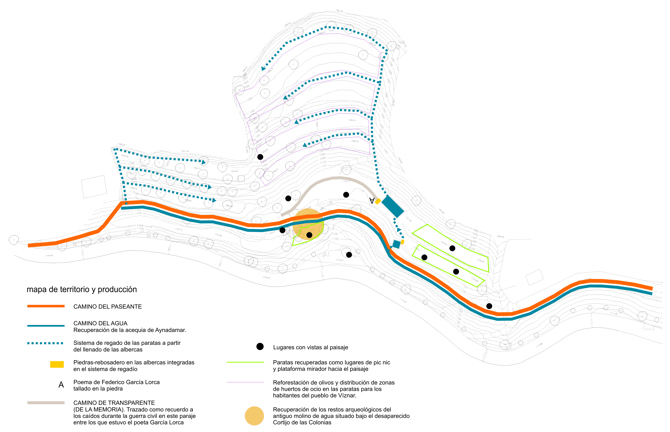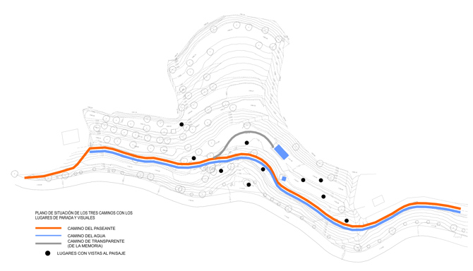 El proyecto recupera la memoria de este paisaje a través de tres recorridos: el camino del paseante, el camino del agua y el camino transparente que, como líneas de una mano, narran los acontecimientos transcurridos en este espacio a lo largo de su historia.