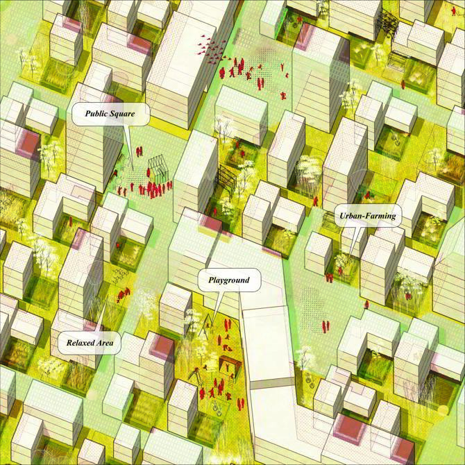 La propuesta urbanística se basa en un soporte plural en lugar de un diseño cerrado. Se estructuró el territorio a través de una matriz de jardines que favorece la porosidad y continuidad del tejido urbano. Alrededor de estos jardines se distribuyen parcelas extrovertidas, que permiten diversidad arquitectónica sin perder la unidad del conjunto. También se incorporaron espacios comunitarios intermedios, los Allmende, que no son ni públicos ni privados, sino zonas verdes de uso compartido y apropiación temporal vecinal.